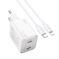 Сетевое зарядное устройство Hoco N42 2 Type-C Power Delivery (45 Вт), білий + кабель Type-C на Lightning