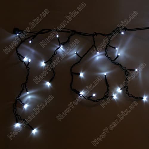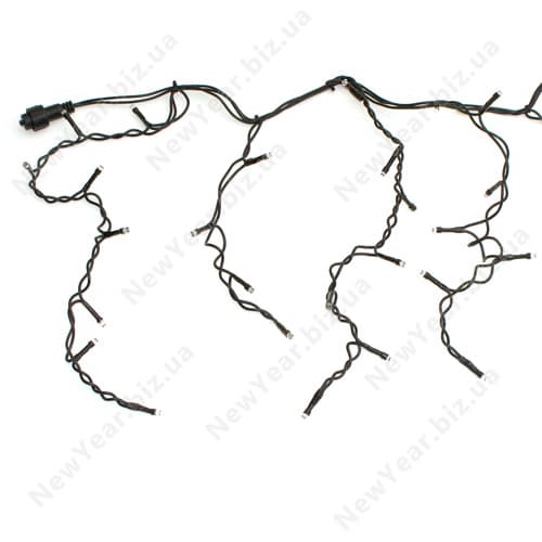 Влагоустойчивая светодиодная гирлянда с черным проводом и ярким белым свечением для украшения деревьев, фасадов домов и помещений с высокой влажностью. Выглядит как один провод длиной 3,5 метра со свисающими ответвлениями длиной от 37 до 50 см с разным количеством светодиодов на них.
