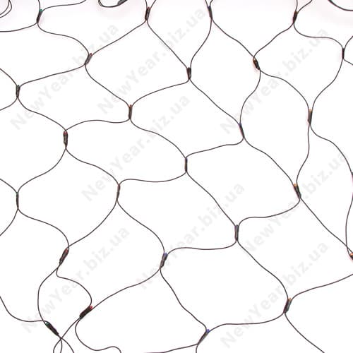 Новогодняя ламповая гирлянда с черным проводом и 4 цветами свечения - красным, зеленым, желтым и синим. Выполнена в виде сетки с равными ячейками.