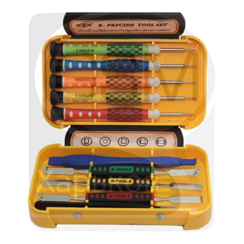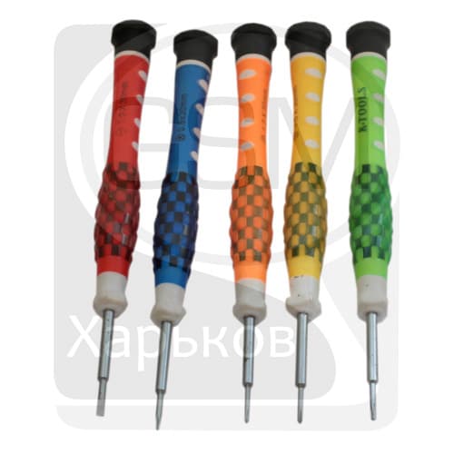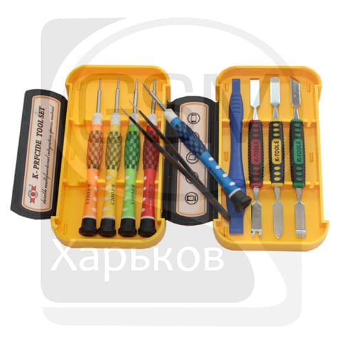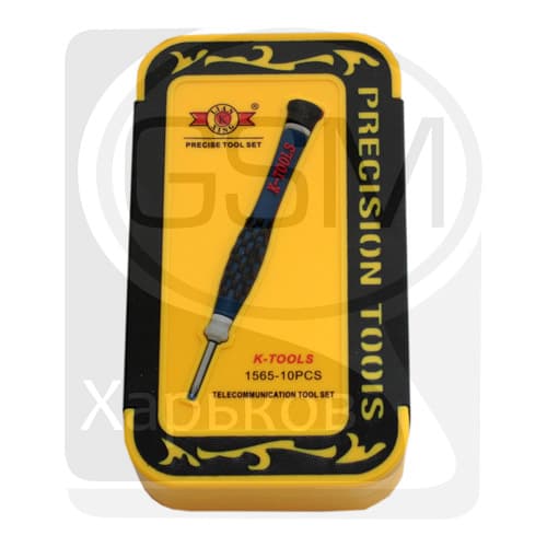 Набор отверток K-Tools 1565 Набор отверток для ремонта телефонов, в том числе iPhone. Набор включает 10 элементов: 1. Отвертки для iPhone: 1.1. Пятигранная отвертка, 0.8 мм. 1.2. Четырёхгранная отвертка, 0.8 мм. 2. Отвертки для телефонов: 2.1. Четырёхгранная отвертка, 1.2 мм. 2.2. Пятигранная отвертка, "Pentalobe", 1.2 мм. 2.3. Шлицевая отвертка "минус", 1.9 мм. 3. Инструмент для открытия защёлок: 3.1. Пластиковая лопатка двусторонняя с шириной 6 и 10 мм. 3.2. Металлическая лопатка двусторонняя с прямым срезом и срезом под вынимание крепежа. 3.3. Металлическая лопатка двусторонняя с острым срезом и скругленным срезом. 3.4. Металлическая лопатка двусторонняя с прямым выступающим срезом и косым под 450 срезом. 4. Металлический пинцет.
