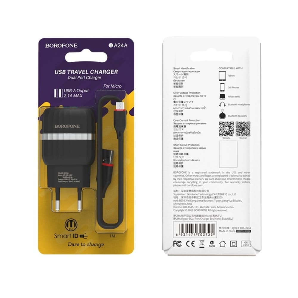 Сетевое зарядное устройство Borofone BA24A, 2 USB, 2.4 А, Micro-USB, черное