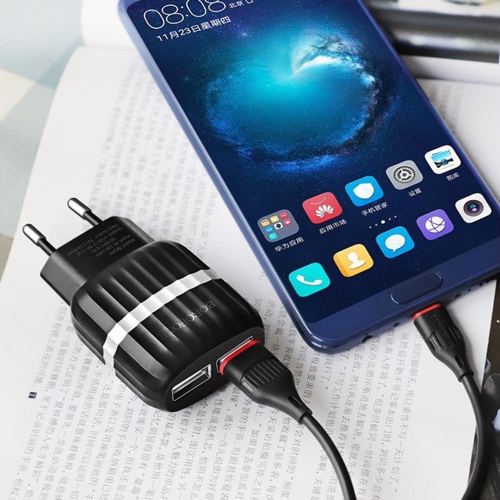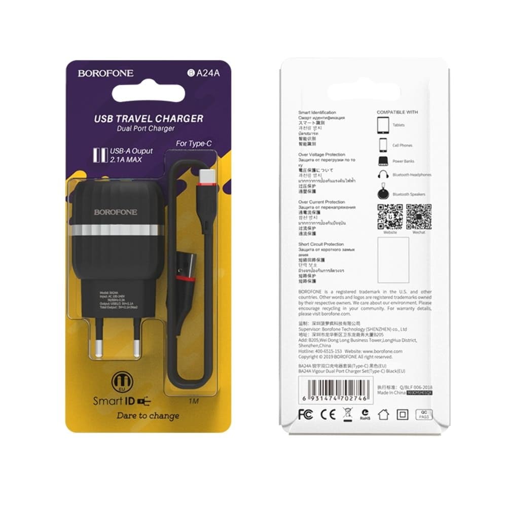 Сетевое зарядное устройство Borofone BA24A, 2 USB, 2.4 А, Type-C, черное