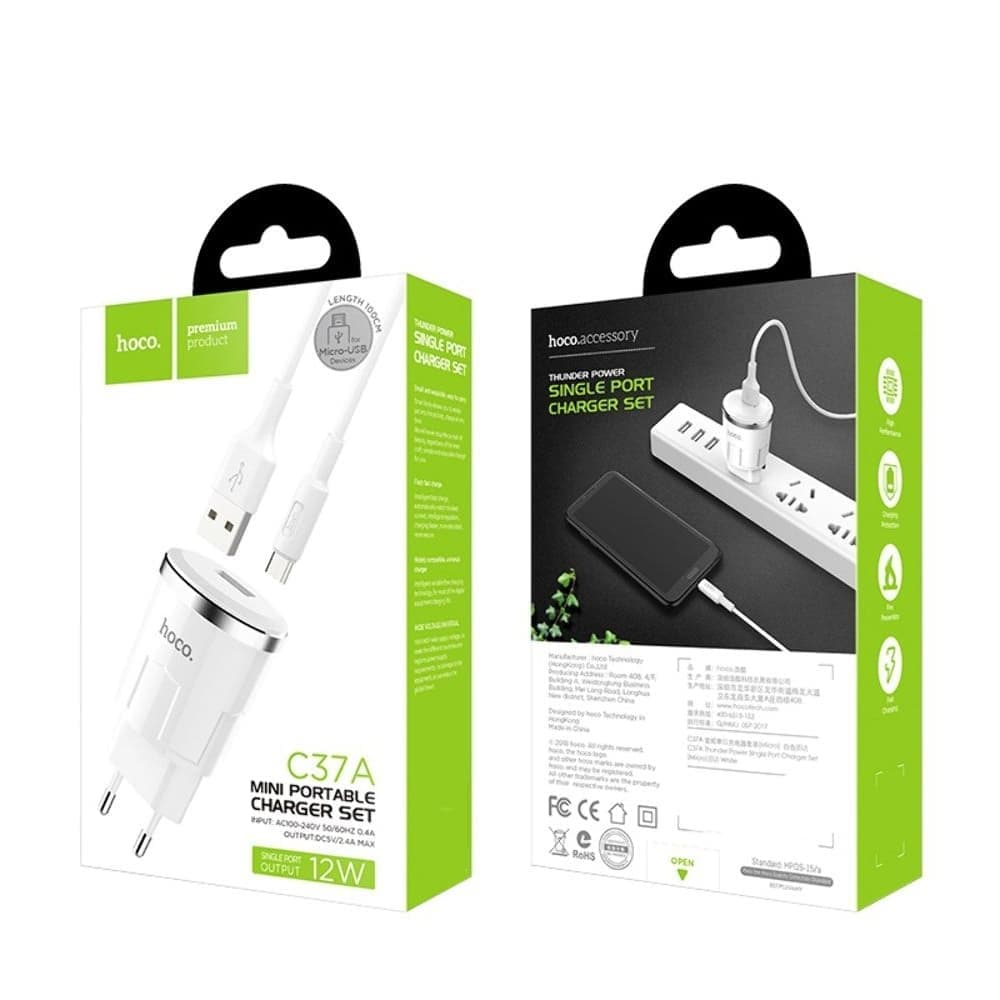 Сетевое зарядное устройство Hoco C37A, 1 USB, 2.4 А, Micro-USB, белое