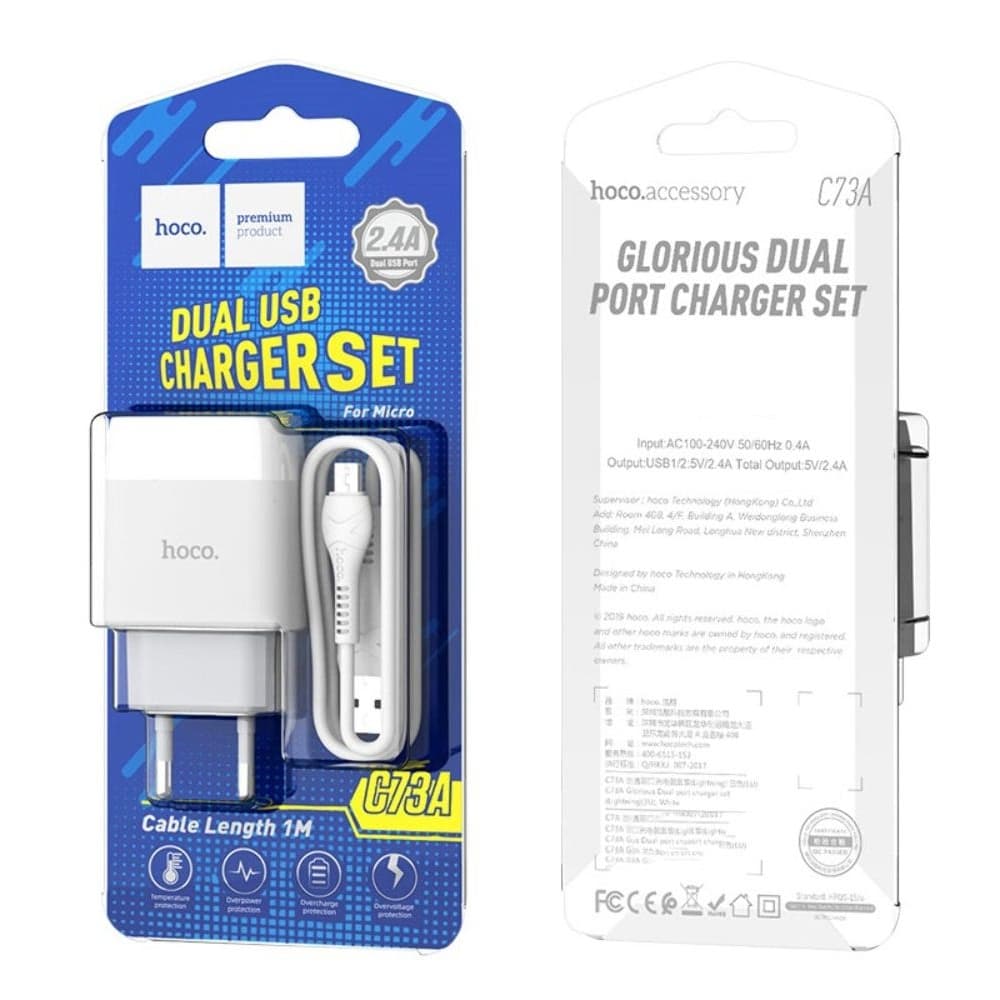 Купить Сетевое зарядное устройство Hoco C73A, 2 USB, 2.4 А, Micro-USB, белое можно и в нашем офисе, платить за доставку при этом не нужно.