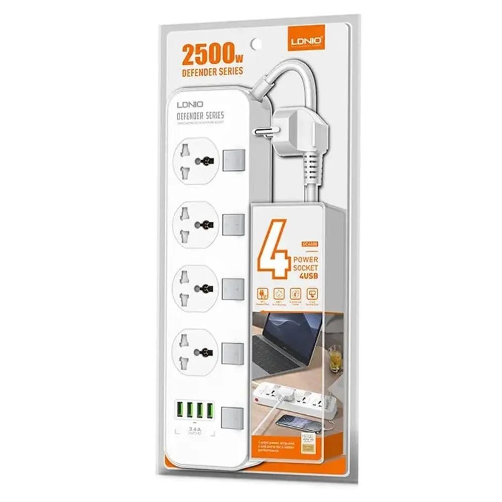 Сетевой удлинитель Ldnio SC4408EU, 4 розетки, 4 USB, 5V, 3.4 А, 17W, кабель 2м., білий