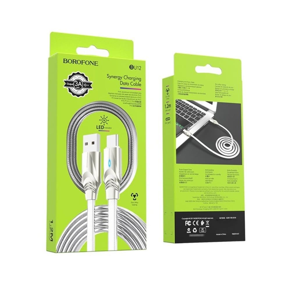 USB-кабель Borofone BU12, Type-C, 120 см 2.4 А, с индикатором, серебристый