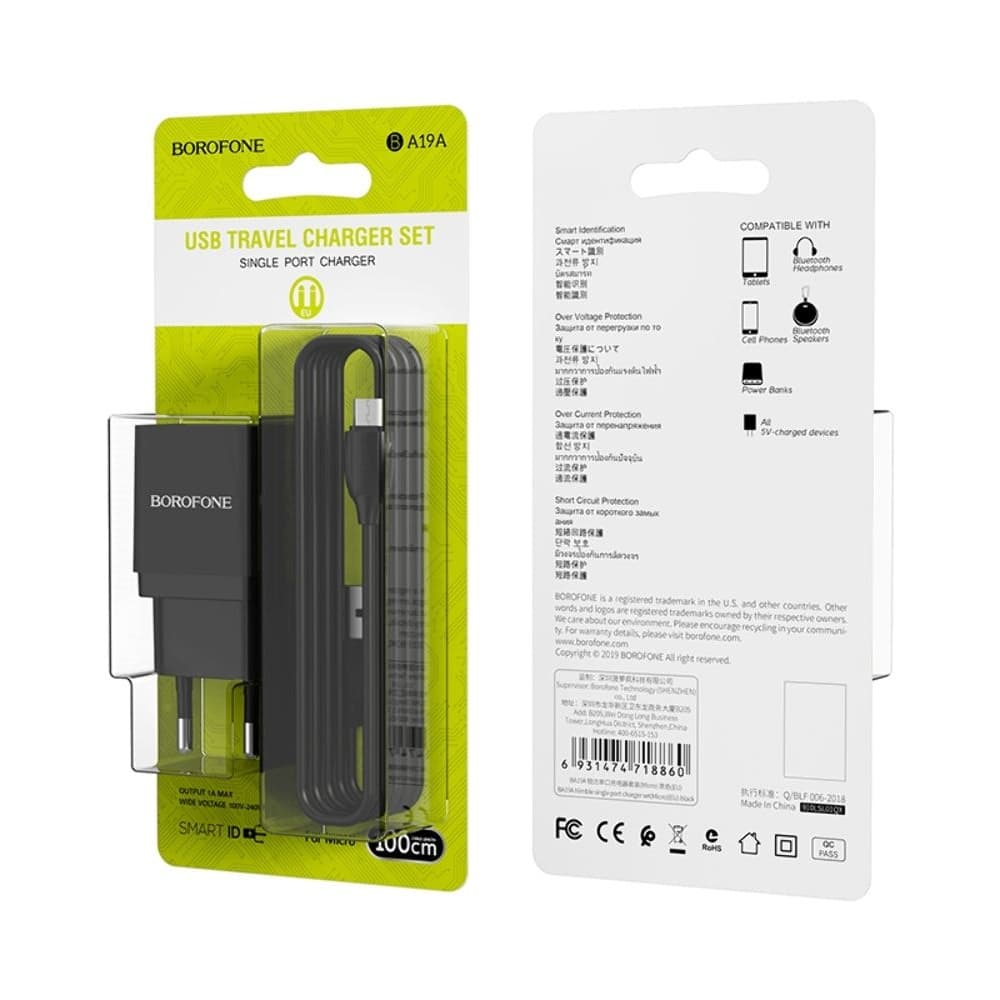 Купить Сетевое зарядное устройство Borofone BA19A, 1 USB, 1A, Micro-USB, черное можно и в нашем офисе, платить за доставку при этом не нужно.
