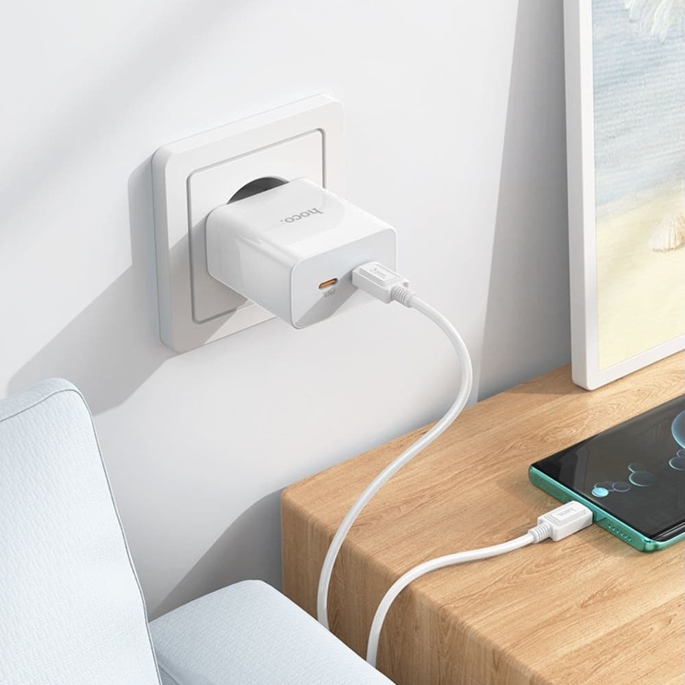 Купить Сетевое зарядное устройство Hoco C108A, 2 USB Type-C, Power Delivery (35 Вт), кабель Type-C на Type-C, белое можно и в нашем офисе, платить за доставку при этом не нужно.