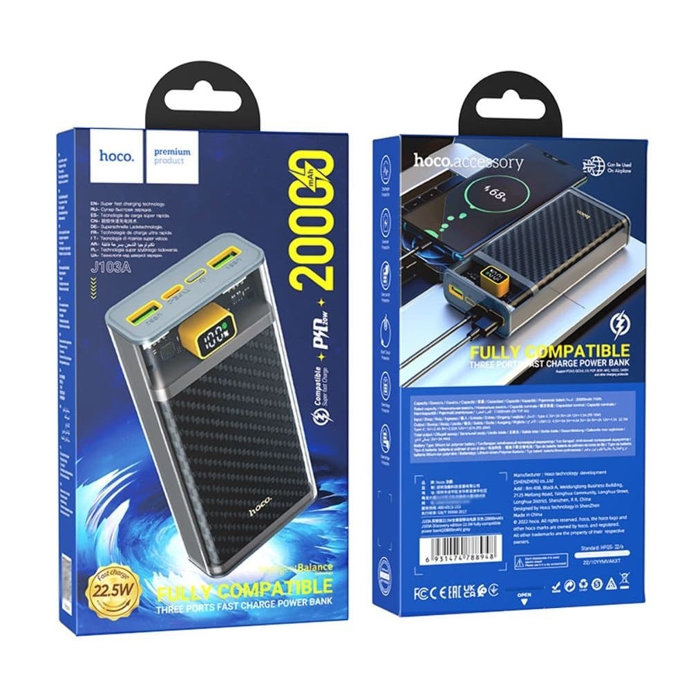 Power bank Hoco J103A, 20000 mAh, 22.5 Вт, Power Delivery (20 Вт), Quick Charge 3.0, сірий