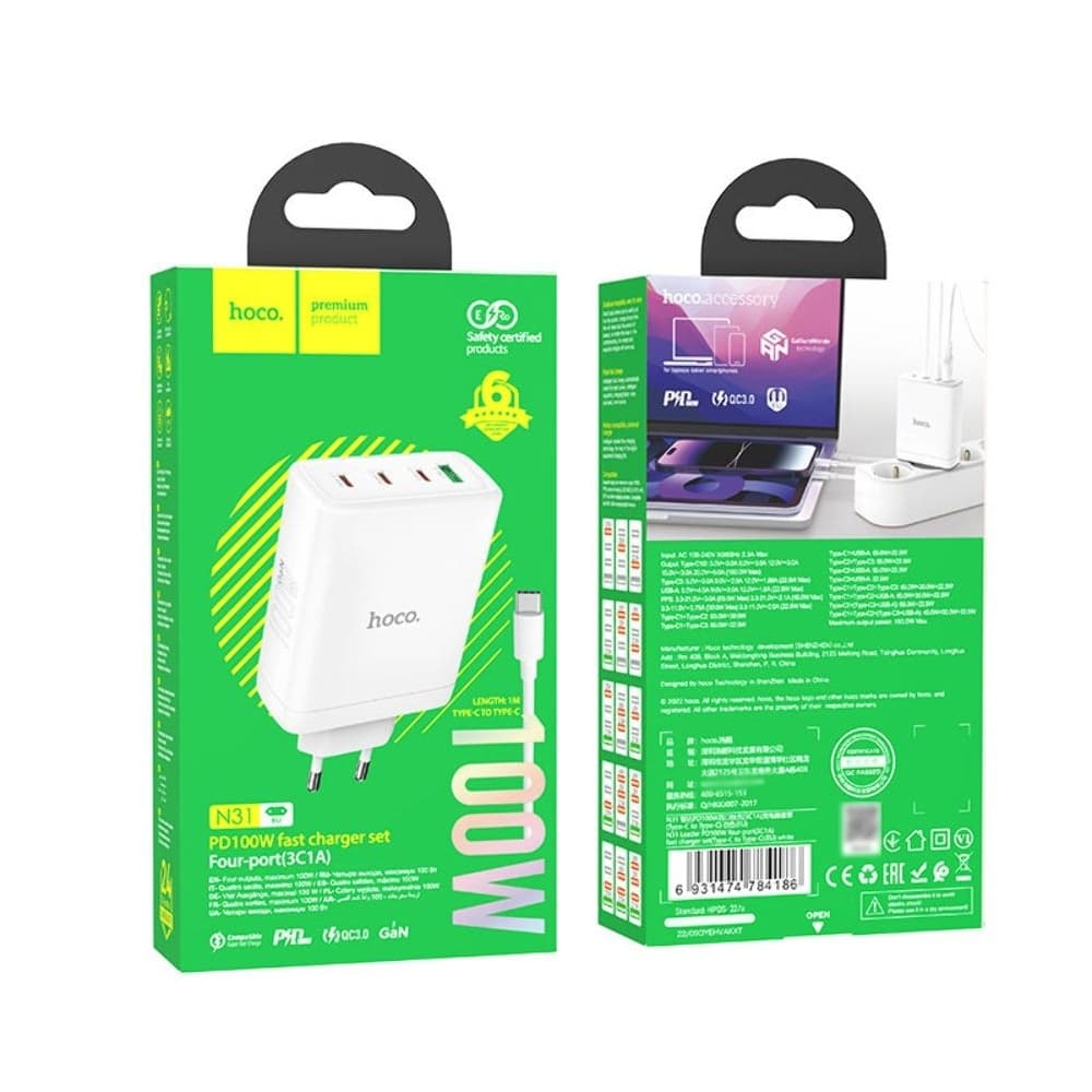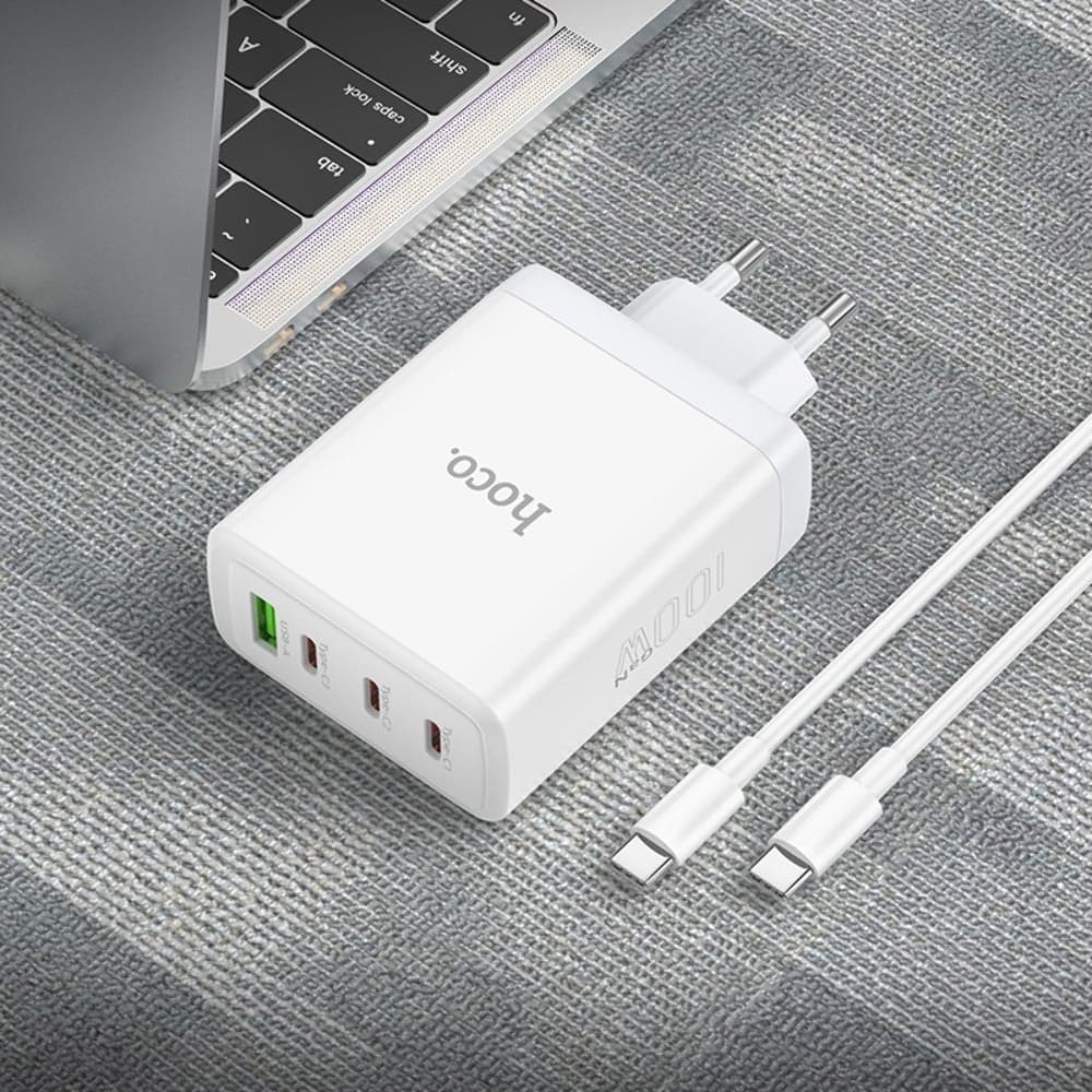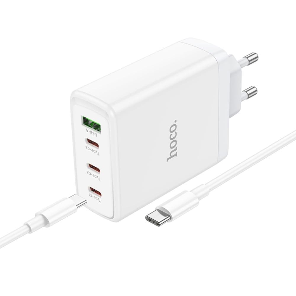 Сетевое зарядное устройство Hoco N31, 1 USB, 3 USB Type-C, Quick Charge, Power Delivery, 100 Вт, кабель Type-C на Type-C, белое