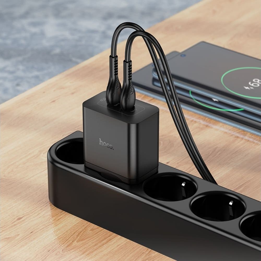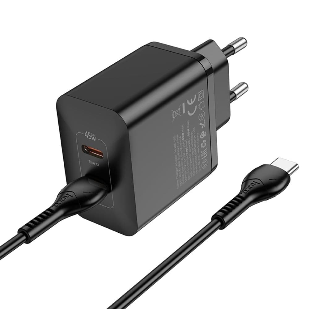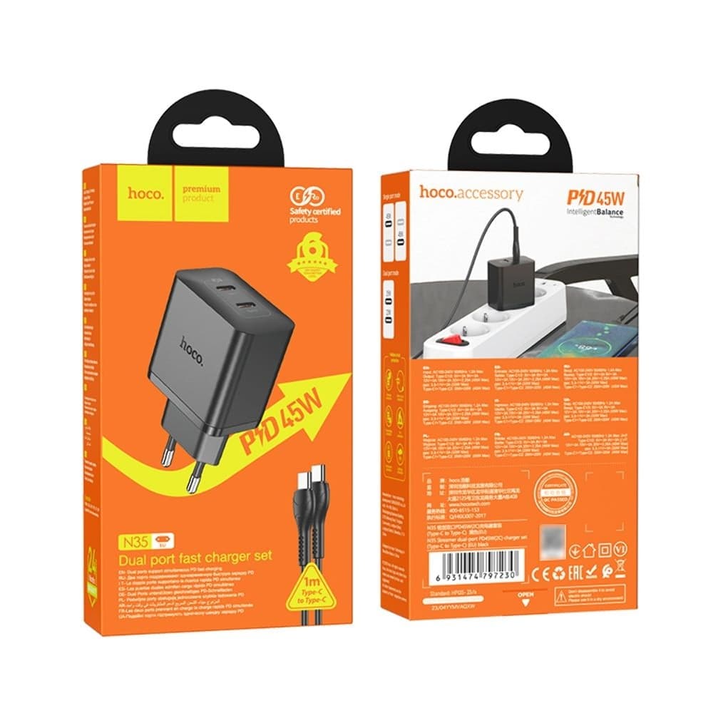 Сетевое зарядное устройство Hoco N35, 2 USB Type-C, Power Delivery (45 Вт), черное, с кабелем Type-C на Type-C