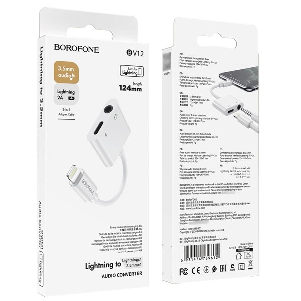 Адаптер переходник Borofone BV12, 2 в 1, аудио конвертер Lightning to Jack 3.5 (F)/ Lightning (F), 12 см, белый